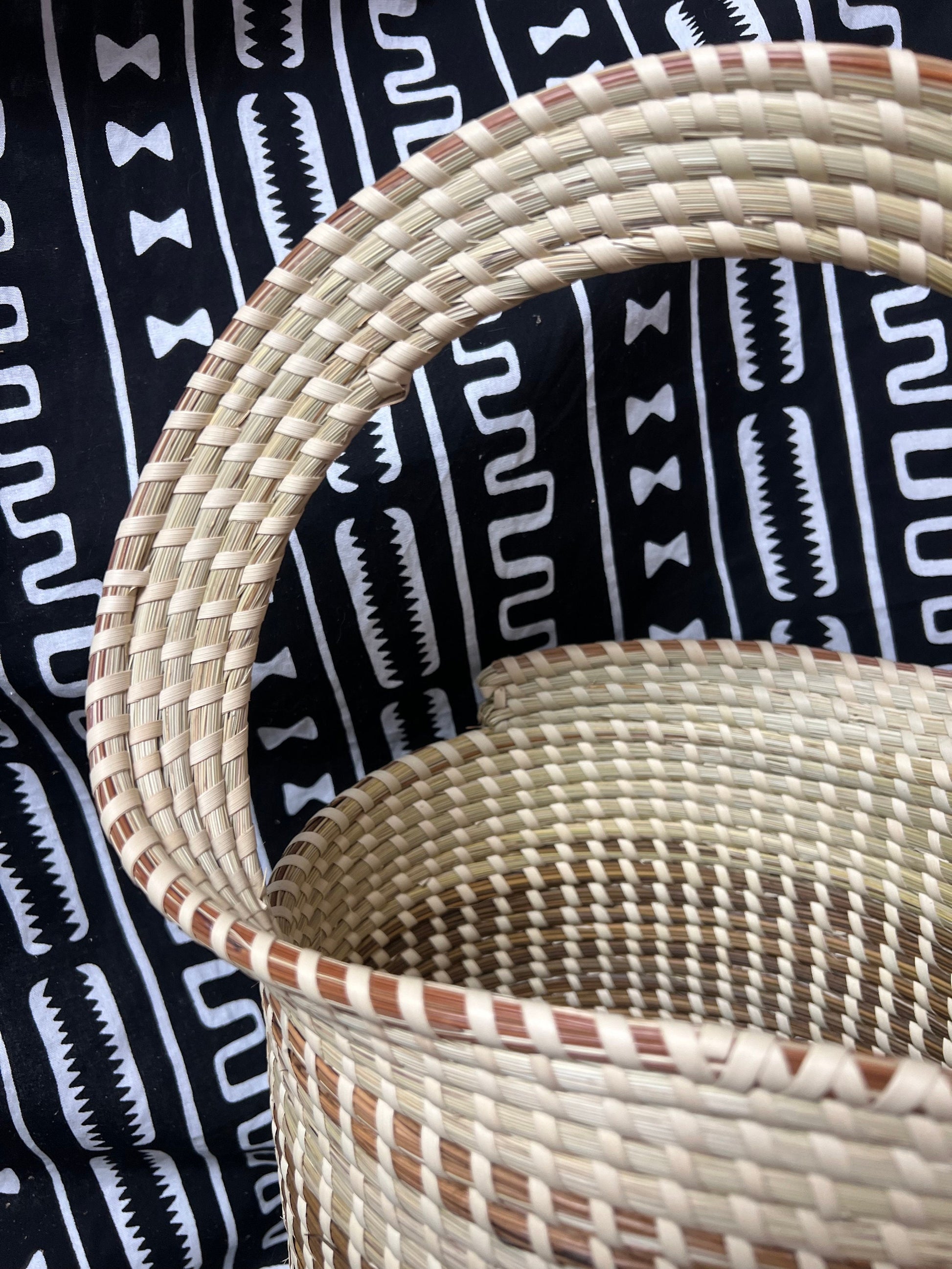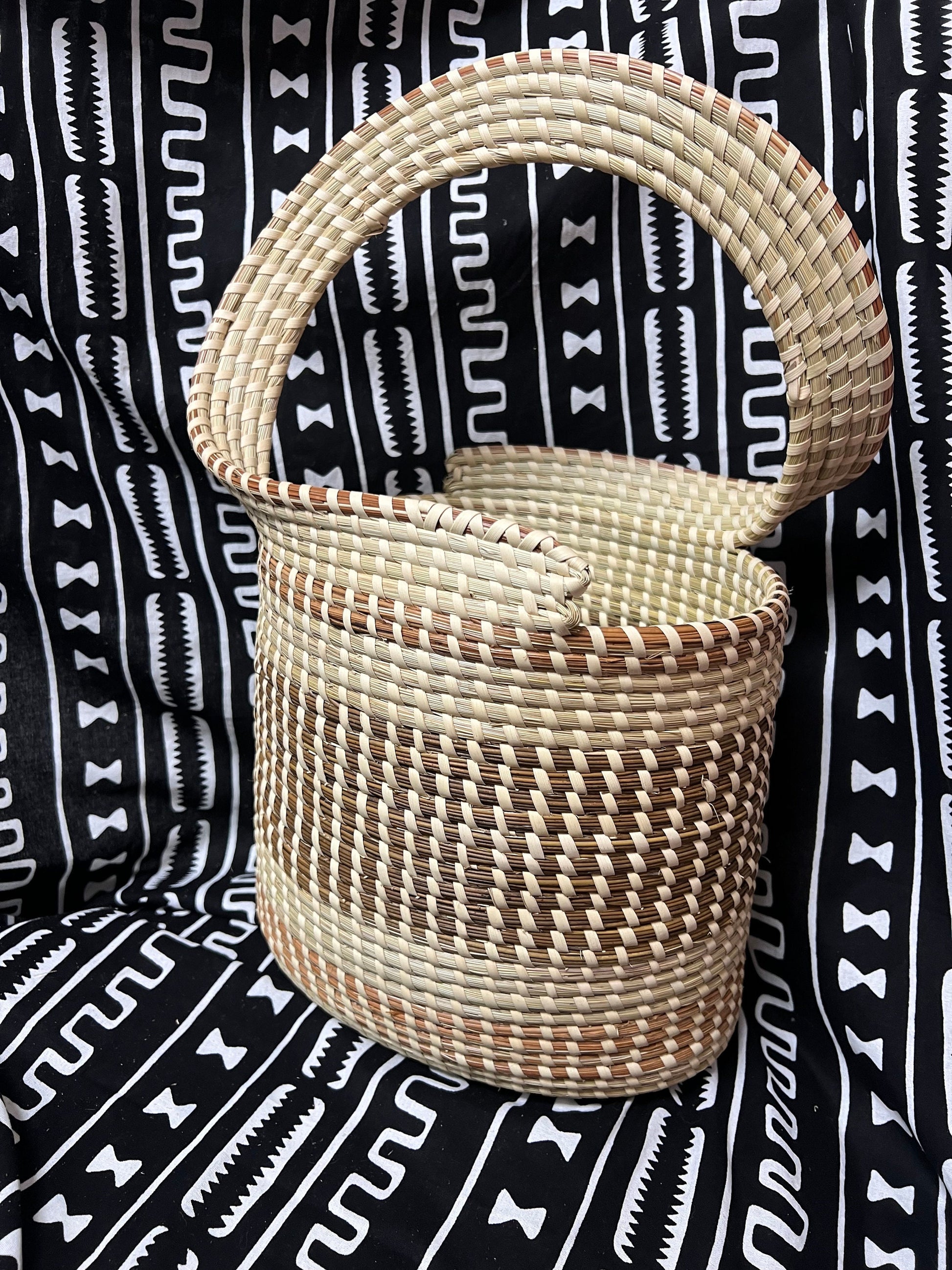 This unique one of a kind twist handle basket is made in the sweetgrass basket sewing tradition of the Gullah community in Charleston South Carolina, this hand-woven basket, is made from locally harvested materials including sweetgrass, pine needles, bulrush, and palmetto.