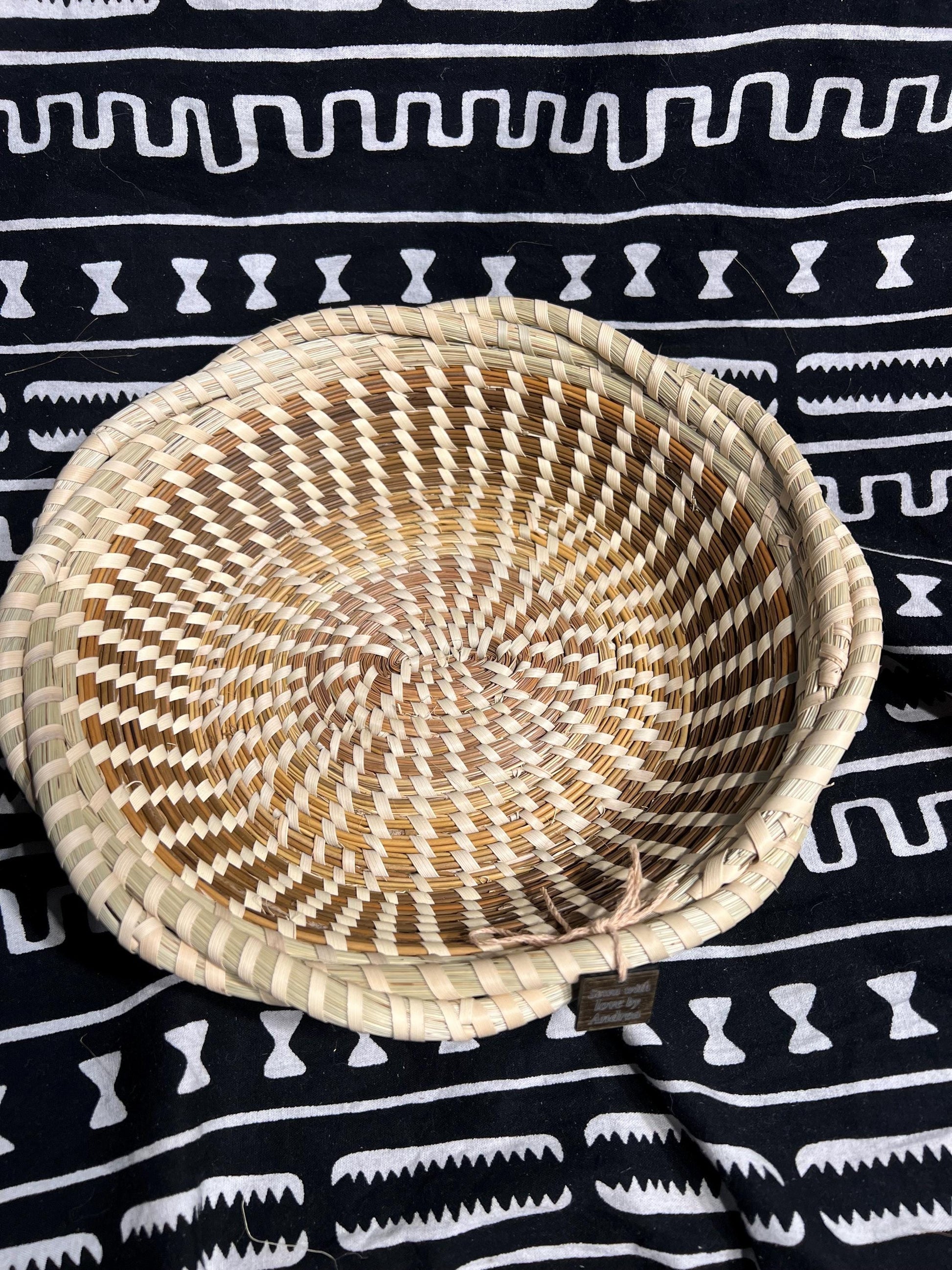 Preserve your basket for generations to come by using soft, damp cloth to remove dust and debris. It is recommended to use a liner for the baskets when placing objects inside, such as a linen, napkin, or light towel. The baskets are strong and woven tightly with locally dried grass and materials, and are best preserved when kept in dry areas to prevent damage. It is not recommended to wash your basket or leave in areas where it can easily get wet.