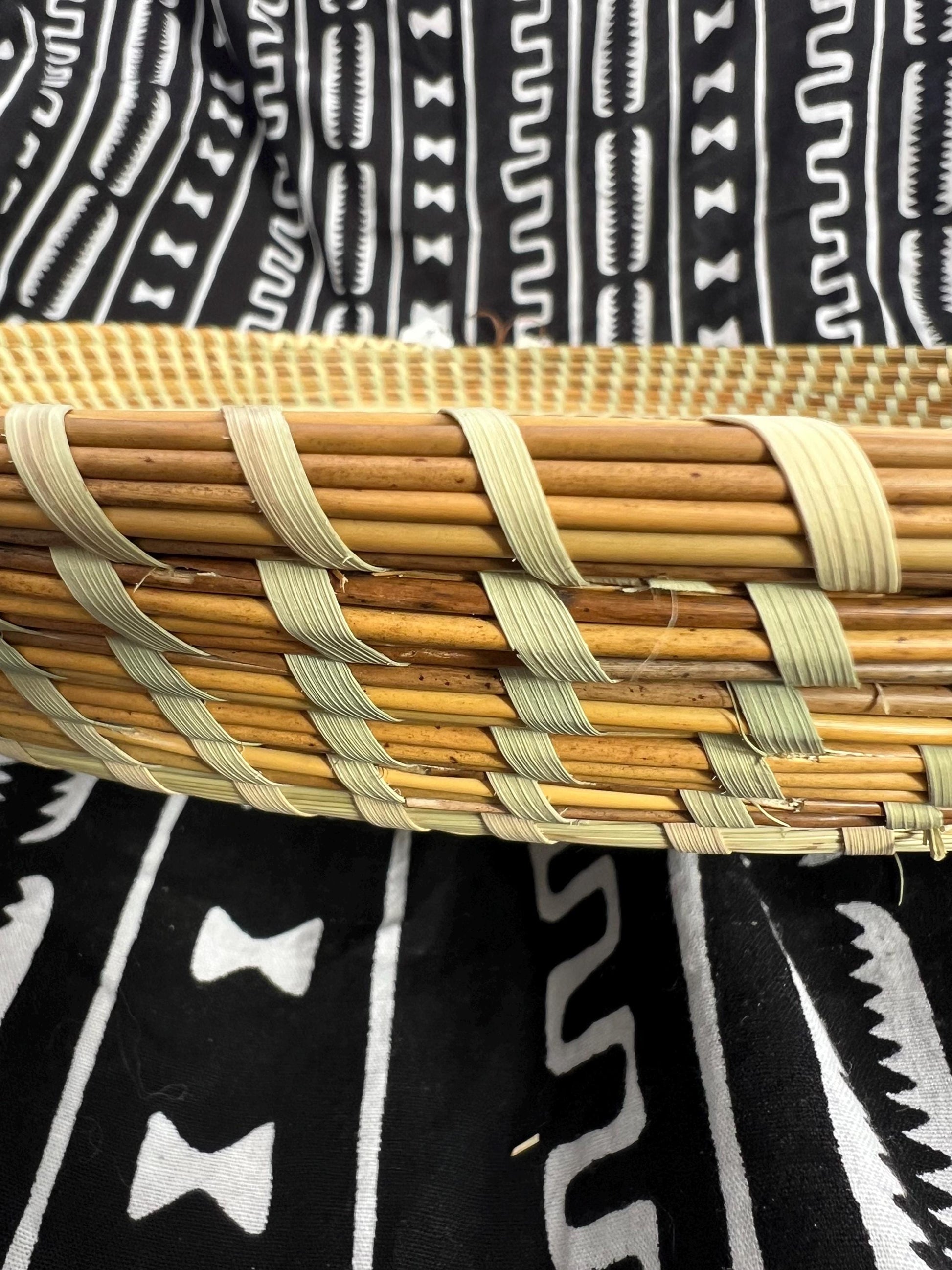 Handcrafted in the sweetgrass basket weaving tradition of the Gullah community in South Carolina, this hand-woven basket, is made from locally harvested materials.